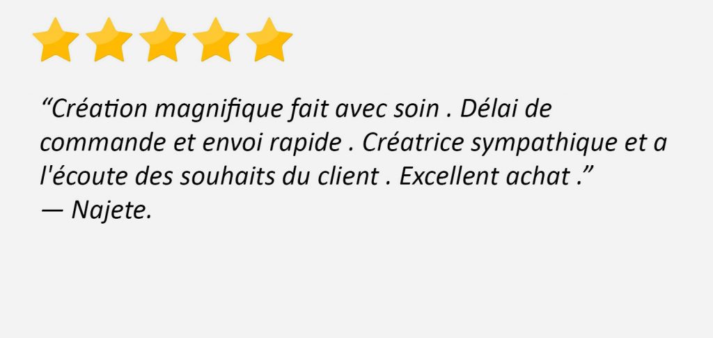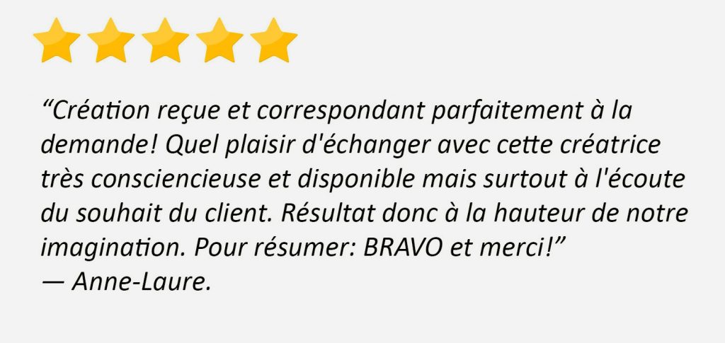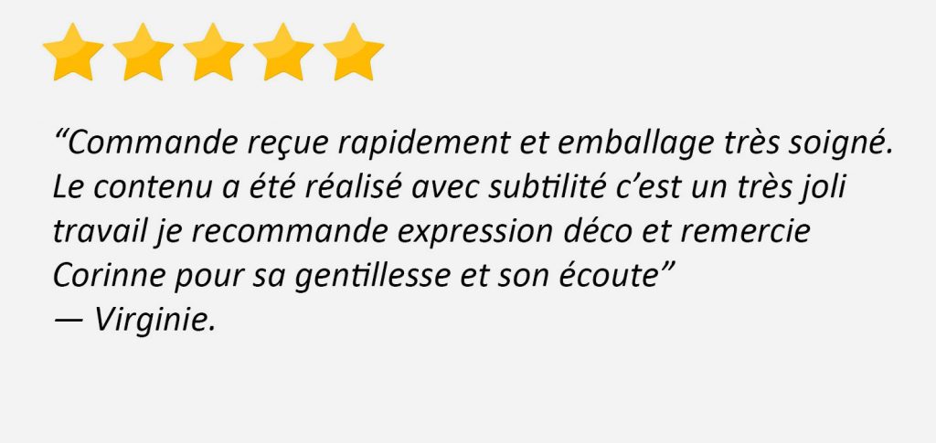 Les délais de réalisation pour les créations personnalisées sont variables et peuvent osciller entre 2 et 4 semaines suivant les périodes. Des mises à jour sont effectuées de manière régulières en page d’accueil de la boutique. En cas de doutes où si vous avez une date butoir en lien avec un évènement particulier, contactez moi via le mail: expressiondéco@gmail.com. Pour plus de renseignement rendez-vous sur la page Délais de réalisation.