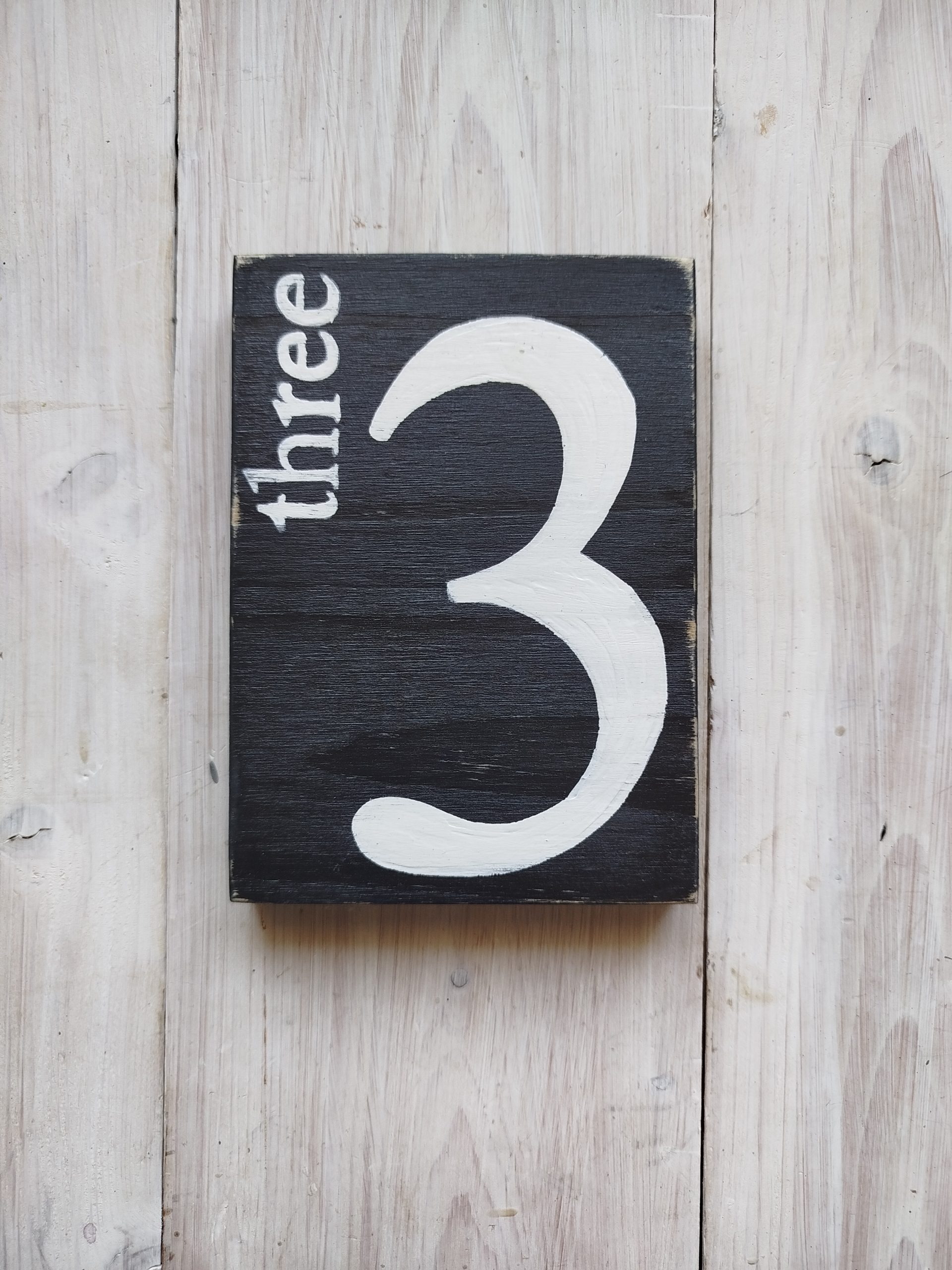 J’ai réalisé ce tableau Three 3 noir et blanc en bois d’une épaisseur de 1,8 cm . Le texte est peint en blanc sur un fond noir patiné. J’ai réalisé la mise en place du lettrage au pinceau et j’ai posé une protection au vernis brillant pour la finition. Tout ça pour pimenter un peu la composition Scrabble qui orne votre mur. Que vous ayez choisi un style vieilli ou naturel, certains éléments peuvent venir s’y entremêler et raconter votre histoire.